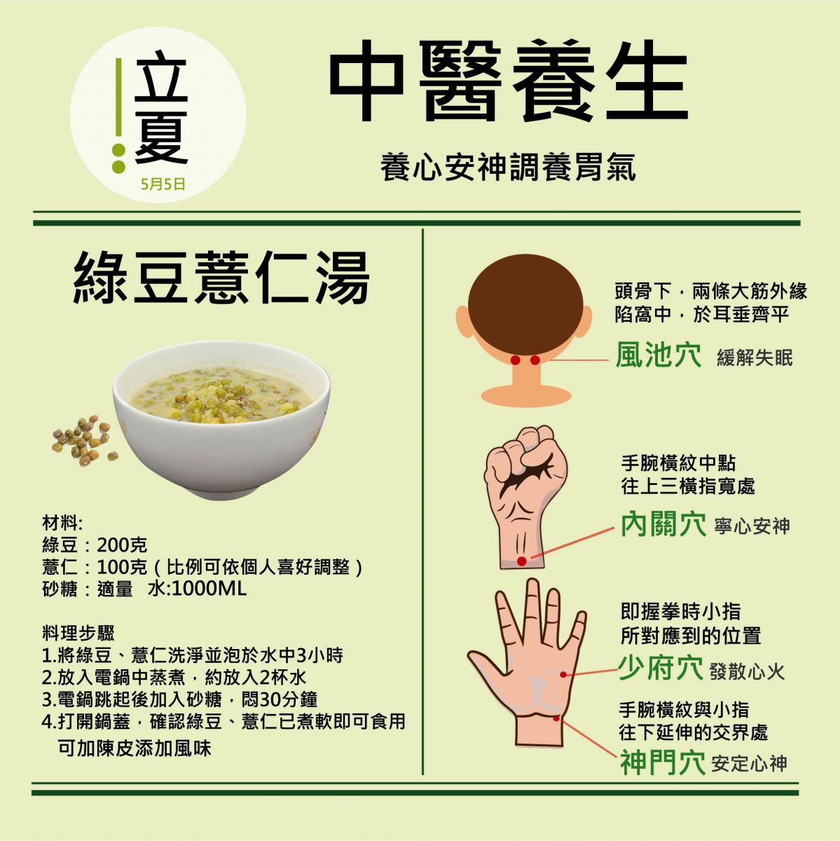 立夏是夏季的開始,氣溫逐漸升高,人體陽氣漸旺,容易出現心火旺、煩躁、失眠等症狀。中醫養生講究「春夏養陽」,此時透過針對性穴位按壓與食療,有助於調和氣血、清熱解暑、安神助眠。以下是針對立夏養生的建議: 保健穴位 ✅ 風池穴(位於頭骨下,兩條大筋外緣陷窩中,於耳垂齊平) 功效:疏風清熱,醒腦明目,緩解頭痛失眠、肩頸僵硬。 建議:每天按壓2-3次,每次3分鐘。 ✅內關穴(手腕橫紋中點往上三橫指寬處) 功效:寧心安神,調理心律,紓解焦慮、胸悶、噁心。 建議:用拇指按壓,左右交替,各按2分鐘。 ✅少府穴(即握拳時小指所對應到的位置) 功效:清心火,安神,改善心煩與口舌生瘡。 建議:手心搓熱後用指腹按壓,可配合深呼吸。 ✅ 神門穴(手腕橫紋與小指往下延伸的交界處) 功效:養心安神,治療失眠、心悸。 建議:睡前按壓3-5分鐘,輕柔按摩效果更佳。 綠豆薏仁湯 材料:綠豆 200克 薏仁100克 水 約1000ml、砂糖適量 做法: 1. 綠豆與薏仁提前泡水2-3小時。 2. 加入清水,大火煮開後轉小火煮30-40分鐘,至熟爛即可。 3. 可依喜好加入少量砂糖或陳皮增香。 功效: 清熱解毒,利水去濕,健脾除煩。 食用建議: 每週2-3次,避免空腹食用,脾胃虛寒者酌量。