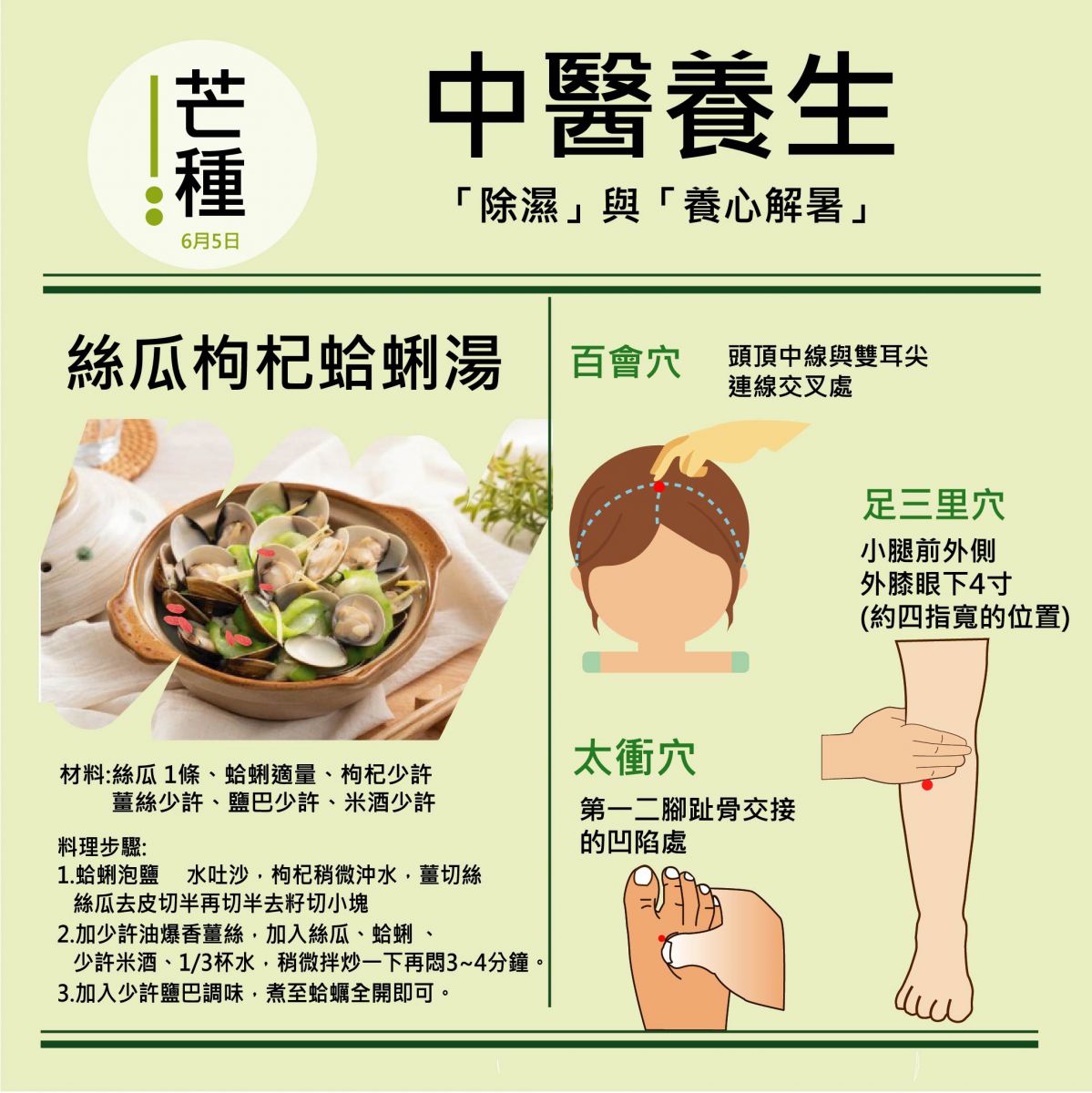 芒種時節,中醫提倡針對節氣特點進行調養 透過按壓特定穴位與食療相輔相成,有助於養心解暑、除濕氣 ✅穴位保健方面,可常按三大重點穴位: 百會穴-位於頭頂中線與雙耳尖連線交叉處 有提神醒腦、安定情緒的功效,適合在悶熱煩躁時按摩 足三里穴-位於小腿外側 有健脾和胃、提升免疫的作用,是夏季保健的重要穴位 太衝穴-位於足背,第一、二趾之間 有助於疏肝理氣、舒緩情緒壓力。每日按壓各穴3–5分鐘,能助養生防病。 ✅飲食方面 絲瓜枸杞蛤蜊湯。 絲瓜清熱化痰、潤燥通便 枸杞滋補肝腎、明目養陰 蛤蜊富含蛋白質,能清熱解毒、補益腎陰,三者合煮,既營養又養生。 做法簡單:將蛤蜊吐沙洗淨,絲瓜削皮切塊,枸杞稍泡後備用。 鍋中加水煮沸,先放蛤蜊煮至開口,再加絲瓜、枸杞略煮5分鐘, 調味即可。此湯清爽甘甜,滋陰又開胃,正合芒種調養之道。 透過穴位按摩與食療調理,可有效緩解芒種時節的濕熱困倦,促進身心和諧。
