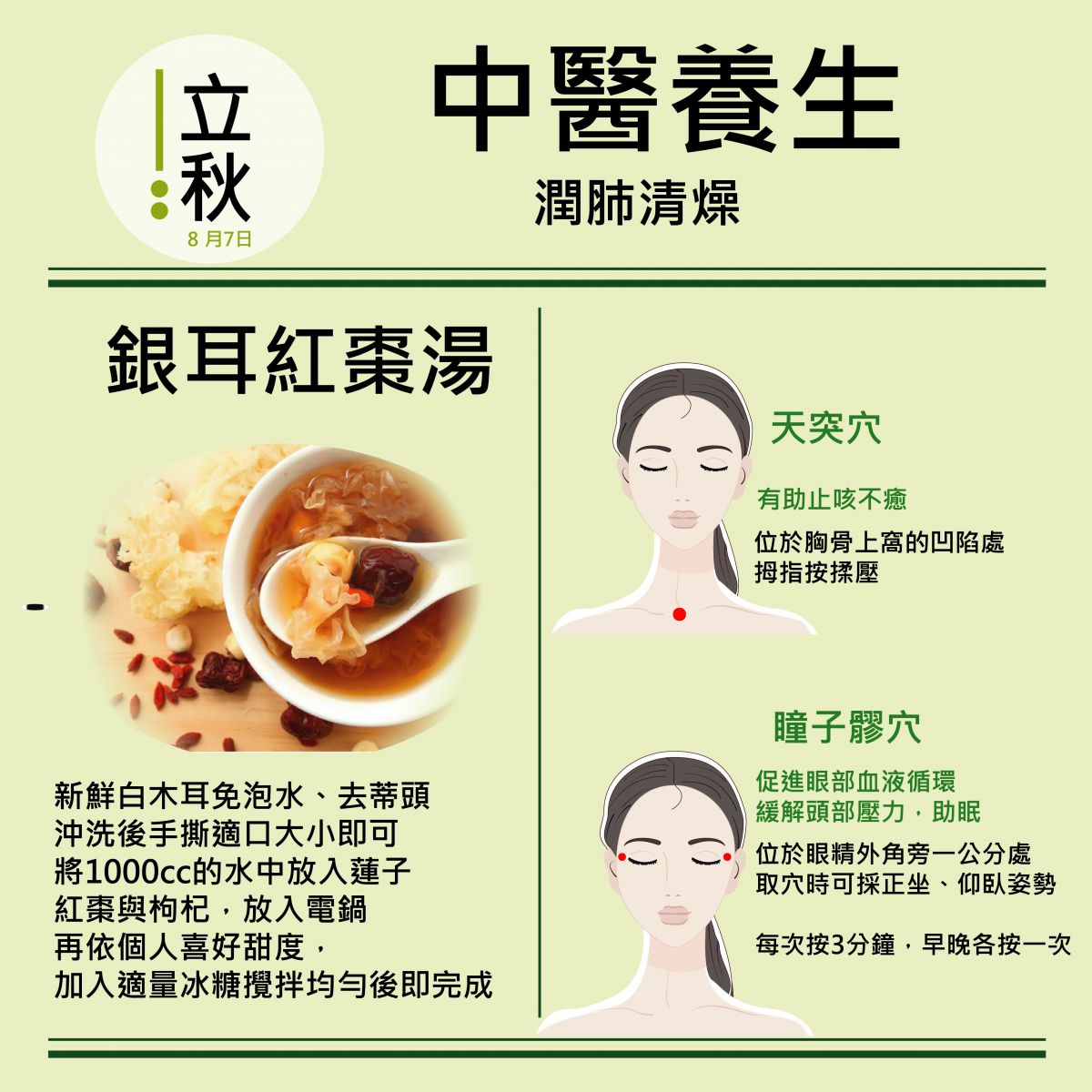 立秋中醫養生|潤肺養陰,迎接轉涼之氣 立秋是由暑轉涼的節氣,雖然天氣仍熱,但「燥」氣開始浮現,中醫認為此時應注重養陰潤肺,為秋冬打好體質基礎。 推薦食材:白木耳 白木耳又稱「平民燕窩」,具有潤肺止咳、養陰潤燥的作用。 可與蓮子、紅棗、枸杞一起煮湯,甜鹹皆宜,是立秋滋補好選擇。 穴位調理: 1️⃣ 天突穴(鎖骨中間凹陷處) 可舒緩喉嚨乾癢、止咳化痰,秋燥容易喉嚨不適時可輕按緩解。 2️⃣ 瞳子髎穴(眼尾凹陷處,靠近太陽穴) 有助滋潤眼睛、緩解乾澀疲勞,對秋天風大眼乾特別有幫助。 每天各穴位按壓 1~2 分鐘,搭配深呼吸,幫助氣血流通、舒緩秋燥不適。