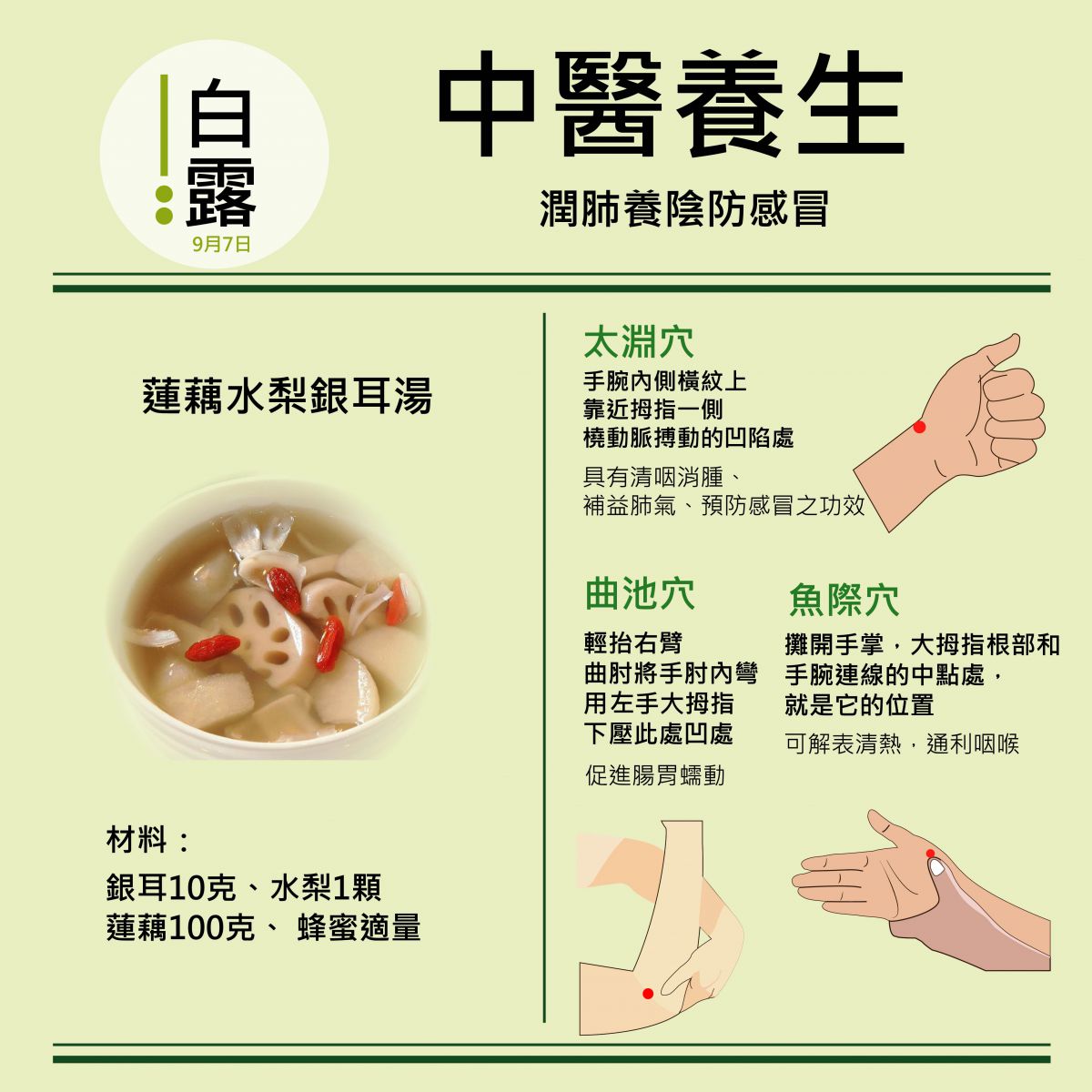白露養生,中醫小叮嚀 白露節氣後,天氣漸涼、早晚溫差大,肺部最容易受寒、燥邪來襲,咳嗽、喉嚨乾癢的人會變多。 中醫養生重點是潤肺養陰、防秋燥。 三個護肺穴位 太淵穴(肺經) 位置:手腕內側橫紋上靠近拇指一側,橈動脈搏動的凹陷處 功效:補肺益氣、改善咳嗽、氣喘 按法:用拇指按壓 1-2 分鐘,每日2-3次 曲池穴(大腸經) 位置:手肘彎曲時,肘窩外側凹陷處 功效:清熱潤燥、舒緩咽喉不適 按法:拇指或食指按揉 1-2 分鐘,每日2-3次 魚際穴(肺經) 位置:手掌拇指根部隆起的肉墊處 功效:清瀉肺熱、止咳化痰 按法:用另一手拇指揉按 1 分鐘,每日2-3次 ???? 白露潤肺湯 — 蓮藕水梨銀耳湯 食材:蓮藕100g、水梨1顆、銀耳10g、蜂蜜適量 作法: 銀耳泡發去蒂撕小片 蓮藕去皮切片、水梨去心切塊 所有食材放入鍋中,加水約1500ml 小火煮 40 分鐘,最後加冰糖調味 功效:潤肺止咳、生津止渴、緩解喉嚨乾癢
